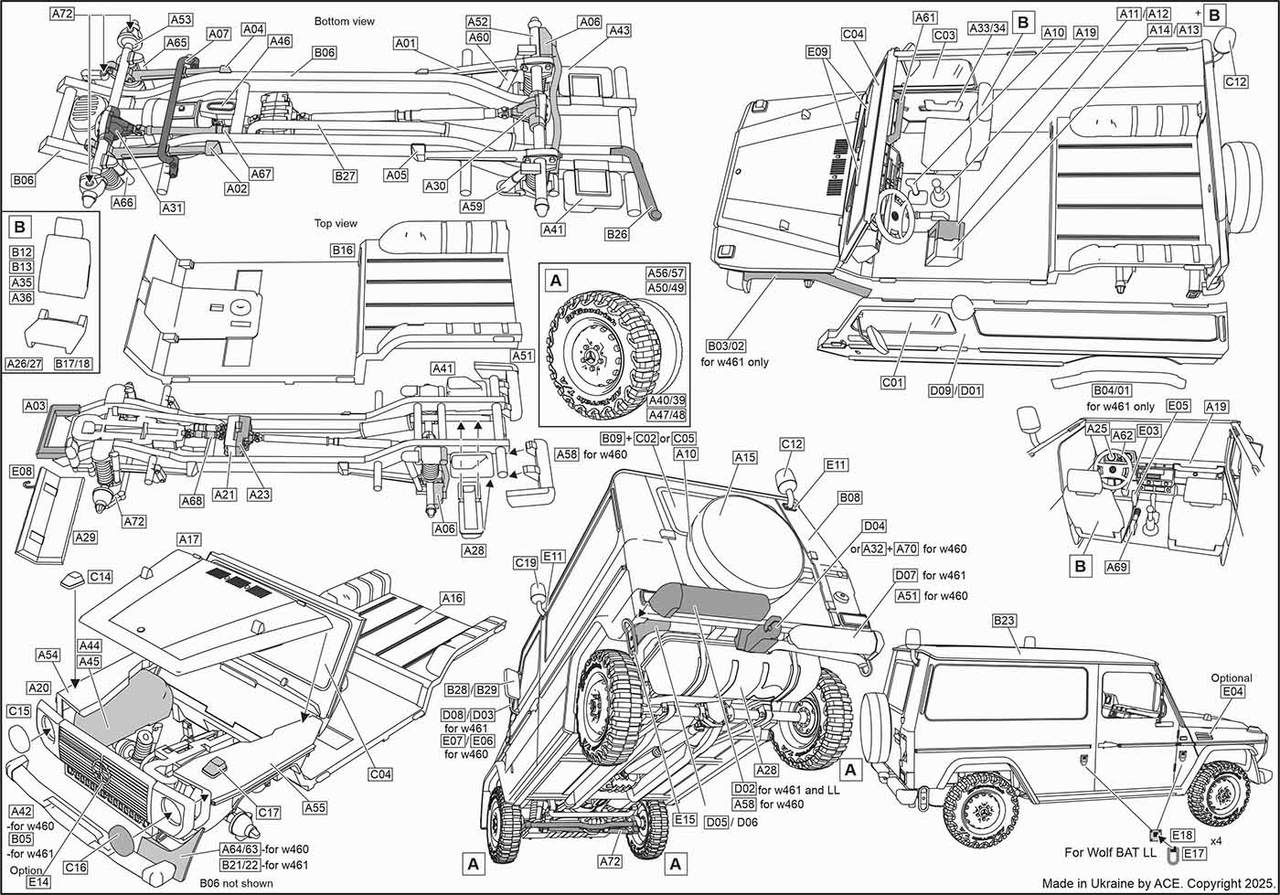 LKW 0,5t gl фургон - (Медична допомога, колісна база 2650) typ460/461 - Wolf BAT LL (Beweglicher ArztTrupp Luftlande = повітряно-десантна медична бригада, тобто аеромобільний польовий медичний підрозділ) був розроблений як військовий транспортний засіб у середині 80-х років. Платформа Typ460/461використовувалася, оскільки вона забезпечує: високу прохідність бездоріжжям/легку вагу (транспортується повітрям) сумісність з авіацією НАТО. BAT LL використовуються: землею за військом, або десантом; як медична підтримка «стрибком».