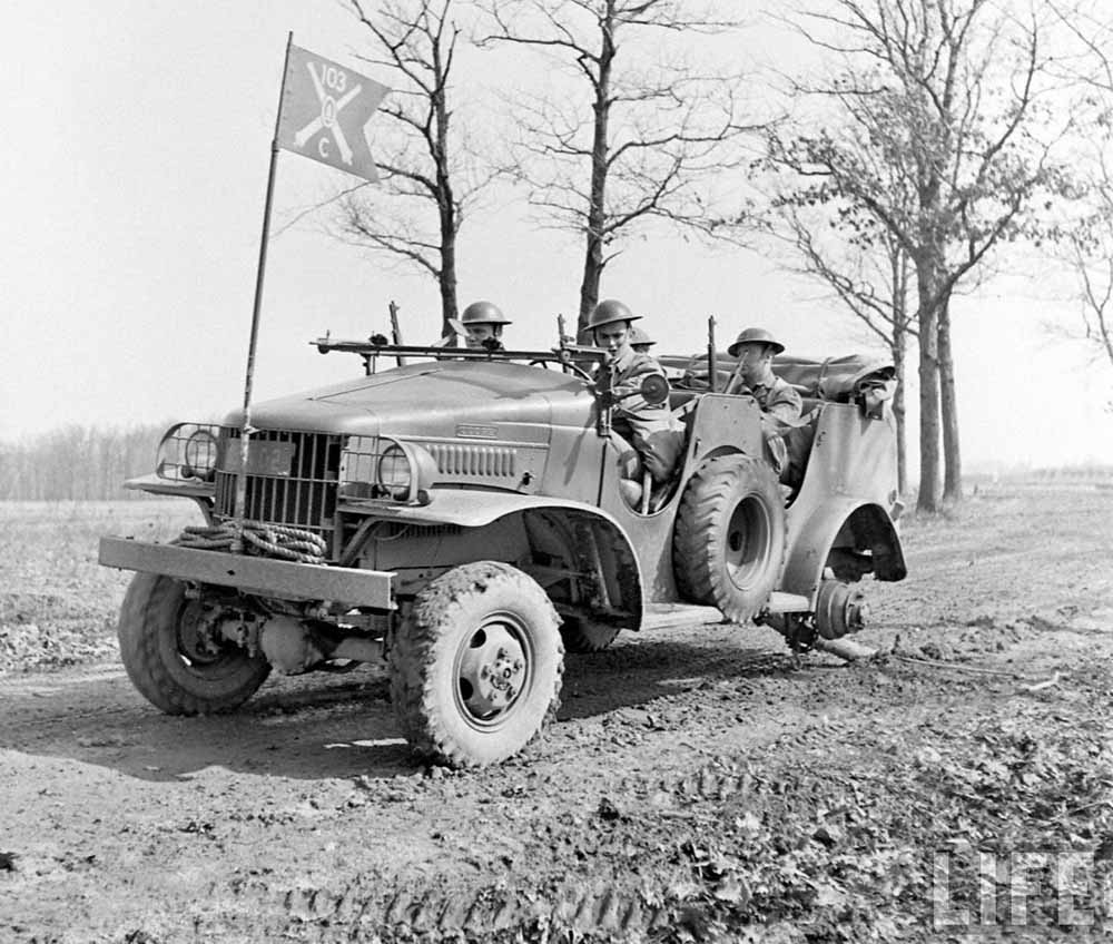 WC-6/15/23 Command Reconnaissance was one of the early U.S. Army ½-ton, 4×4 trucks built by Dodge during World War II (open-top, 4-door body with canvas roof and side curtains). It belonged to the same family as the WC-series light military trucks, which were precursors to the more common ¾-ton WC models. Vehicles were fitted with map tables, stowage for radios, and communication equipment; designed to act as a mobile command post / staff car in the field. Some carried a .30 cal or .50 cal machine gun on a pedestal mount
